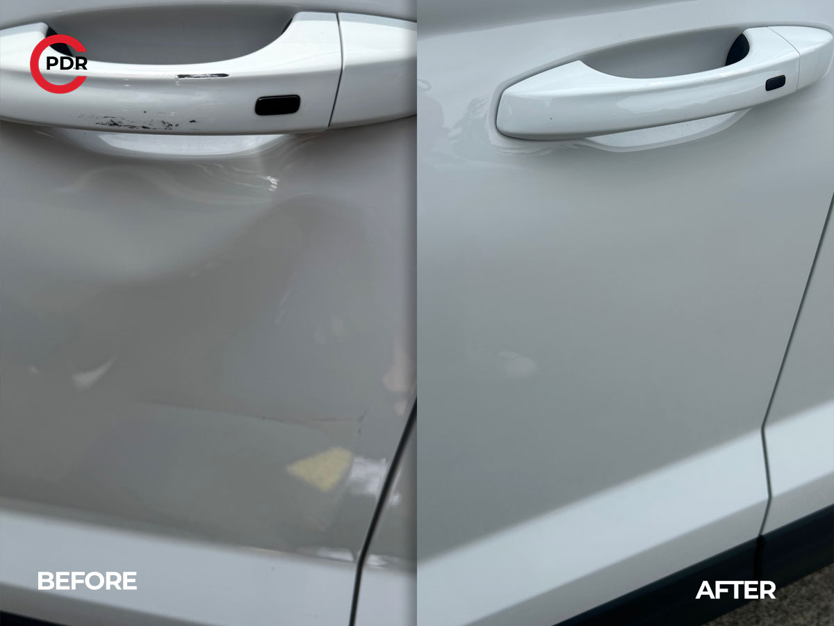 That said, it’s still significantly less expensive than traditional body repair, which involves sanding, filling, and repainting. Plus, PDR is much faster and more convenient: we come to you—whether it’s your home, office, or dealership—so you don’t have to drop off your car at a shop.