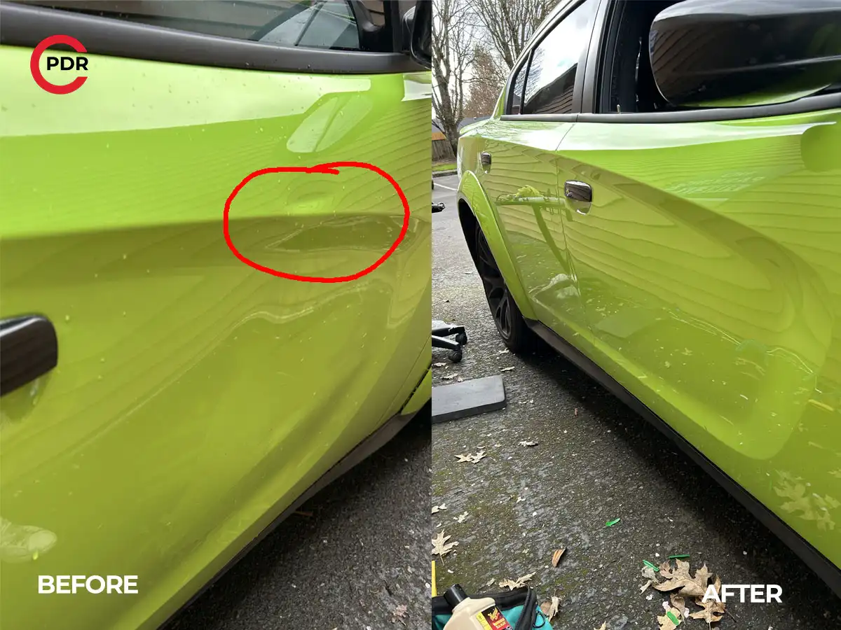 That said, it’s still significantly less expensive than traditional body repair, which involves sanding, filling, and repainting. Plus, PDR is much faster and more convenient: we come to you—whether it’s your home, office, or dealership—so you don’t have to drop off your car at a shop.